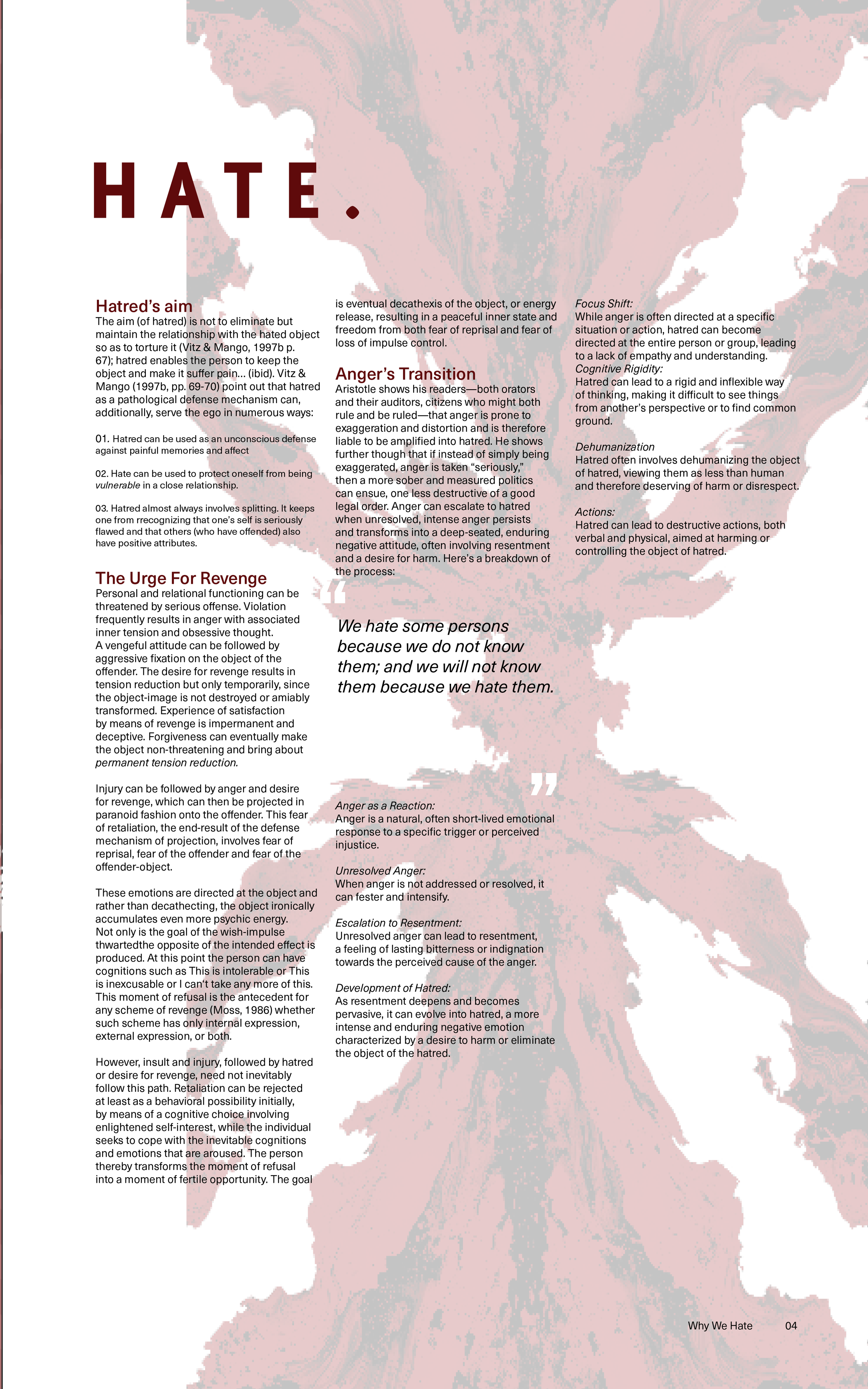 Hatred is a universal emotion. It can wither away relationships, mental health, and even cause harm to others. When uncontrolled or unchecked hatred if left unaddressed, can be life-altering - all it takes is one mistake. This is why “From Hate To Healing” exists. A project dedicated to helping others acknowledge what hate is and how it infects our minds in the first place. Understanding why we hate is a crucial part of the healing process, as being unclear about it can lead to impulsive decisions. Once we understand why the healing process can truly begin, we go on a journey of self-understanding. Finally, we can approach the forgiveness aspect of the hate cycle. Whether it is forgiving yourself, another person, or the situation at hand, to truly be free, forgiveness is key. We learn from our past; simply forgetting the situation may not be enough, so we must also break free from the traumas that cause hatred.