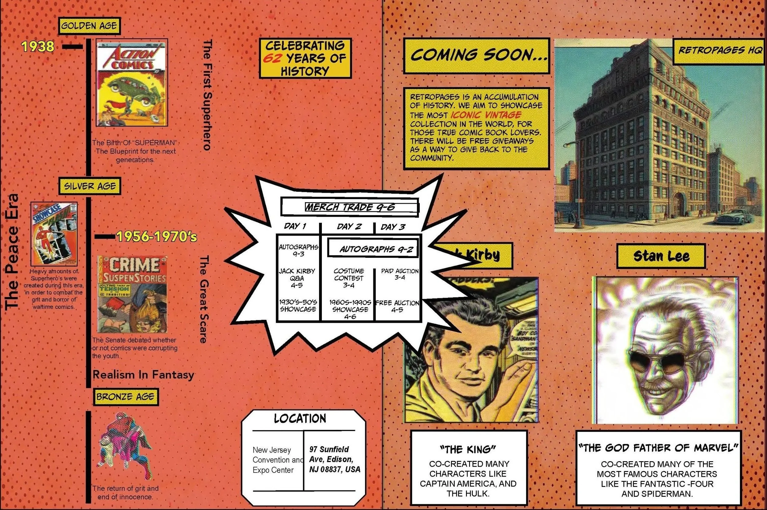 To advertise this event, we created a brochure containing the necessary information. It’s older, decayed look is supposed to remind the audience of how older comics would look in the modern era. There is a slight color error throughout all the images, as well as visible pixels, which was a common problem when printing comics in earlier eras. The most important part of this piece is the pop-up itinerary, which is located in the middle of the back pages. This event would feature legendary special guests who played a pivotal role in creating some of the comic book industry's most important characters, such as Stan Lee and Jack Kirby. This brochure features a timeline of comic books, ranging from the Golden Age to the Bronze Age, which are the time periods this convention focuses on. This helps the audience get a feel for what to expect in terms of which comics will be present at the event.